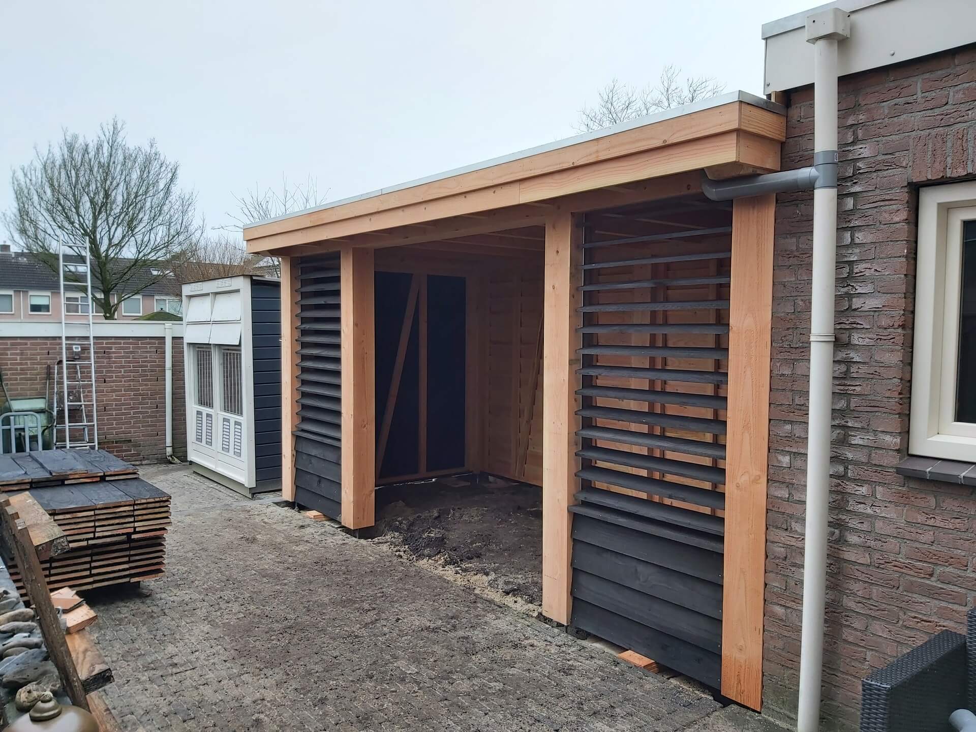 In Nijverdal bouwden we een stijlvolle prefab overkapping met draaibare shutters. Een praktisch en luxe project dat comfort en uitstraling samenbrengt.