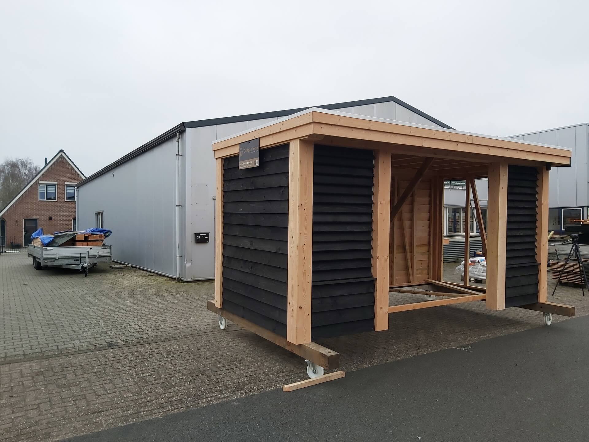De constructie is uitgevoerd in 20 x 20 cm balken van douglas hout. Voor de gevelbekleding kozen we voor douglas planken in zwart, zowel aan de buitenzijde als aan de binnenzijde. Dit zorgt voor een moderne en strakke uitstraling die mooi aansluit bij de tuin.